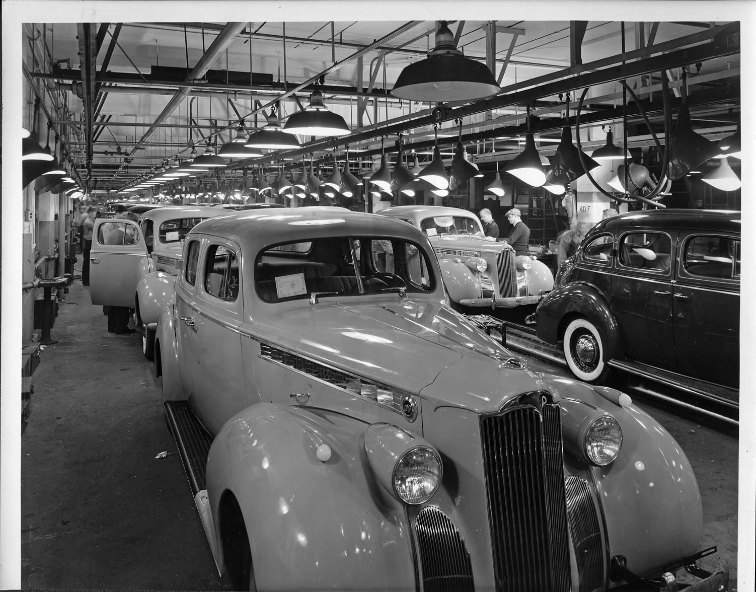 Favorite this☆ 1936 Packards coming off assembly line Description: Packard Co. file photograph of 1936 Packards coming off the assembly line, workers in right background. Inscribed on photo back: "Packard models coming off the assembly line, final assembly line (after 1936 change)." Details Resource ID: EB01e814 Creator: Packard Motor Car Company Subject: Packard automobile Automobile factories--Michigan--Detroit Assembly-line methods Photographic prints Date Issued: 1936 Format: 1 photographic print ; 8 x 10 in. Member of: National Automotive History Collection Packard Collection Rights: Physical rights are retained by DPL. Copyright is retained in accordance with U.S. copyright laws.