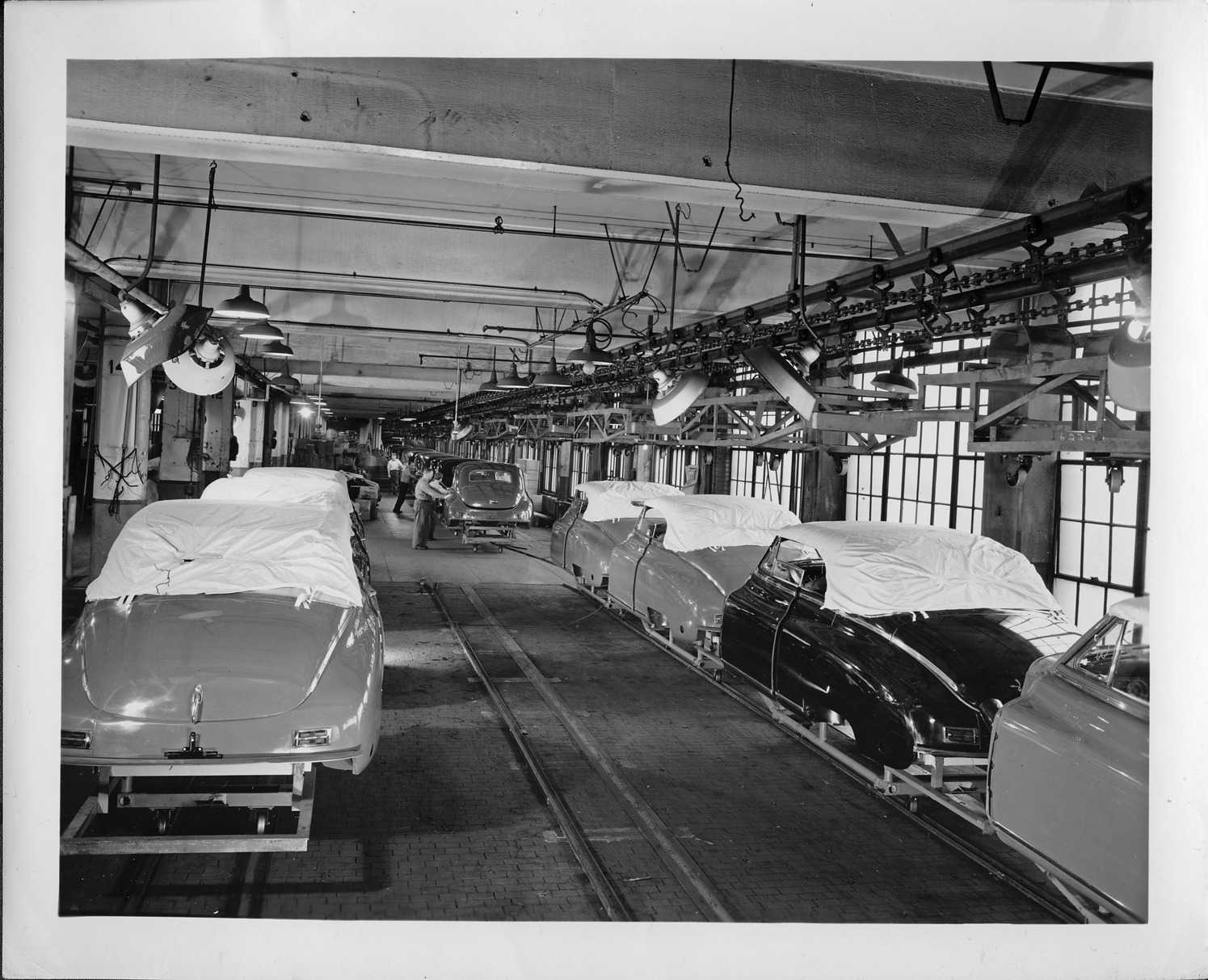 Packard Co. file photograph of 1948-49 Packard bodies on assembly line, workers in background. Inscribed on photo back: "1948-49 Packard super eight, twenty-second series, model 2232, 8-cylinder, 145-horsepower, 120-inch wheelbase, convertible victoria (body type #2279), first twenty-second series Packards on the line, alongside twenty-first series Clippers, spring 1947."