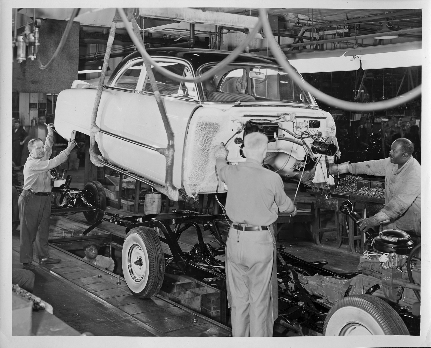 Favorite this☆ 1951-54 Packard on assembly line at body drop Description: Packard Co. file photograph of 1951-54 Packard on assembly line at body drop, three workers guiding body down to meet with chassis and engine. Details Resource ID: EB01e833 Creator: Packard Motor Car Company Subject: Packard automobile Automobile factories--Michigan--Detroit African American automobile industry workers Photographic prints Date Issued: 1951 to 1954 Format: 1 photographic print ; 8 x 10 in. Member of: National Automotive History Collection Packard Collection Rights: Physical rights are retained by DPL. Copyright is retained in accordance with U.S. copyright laws.