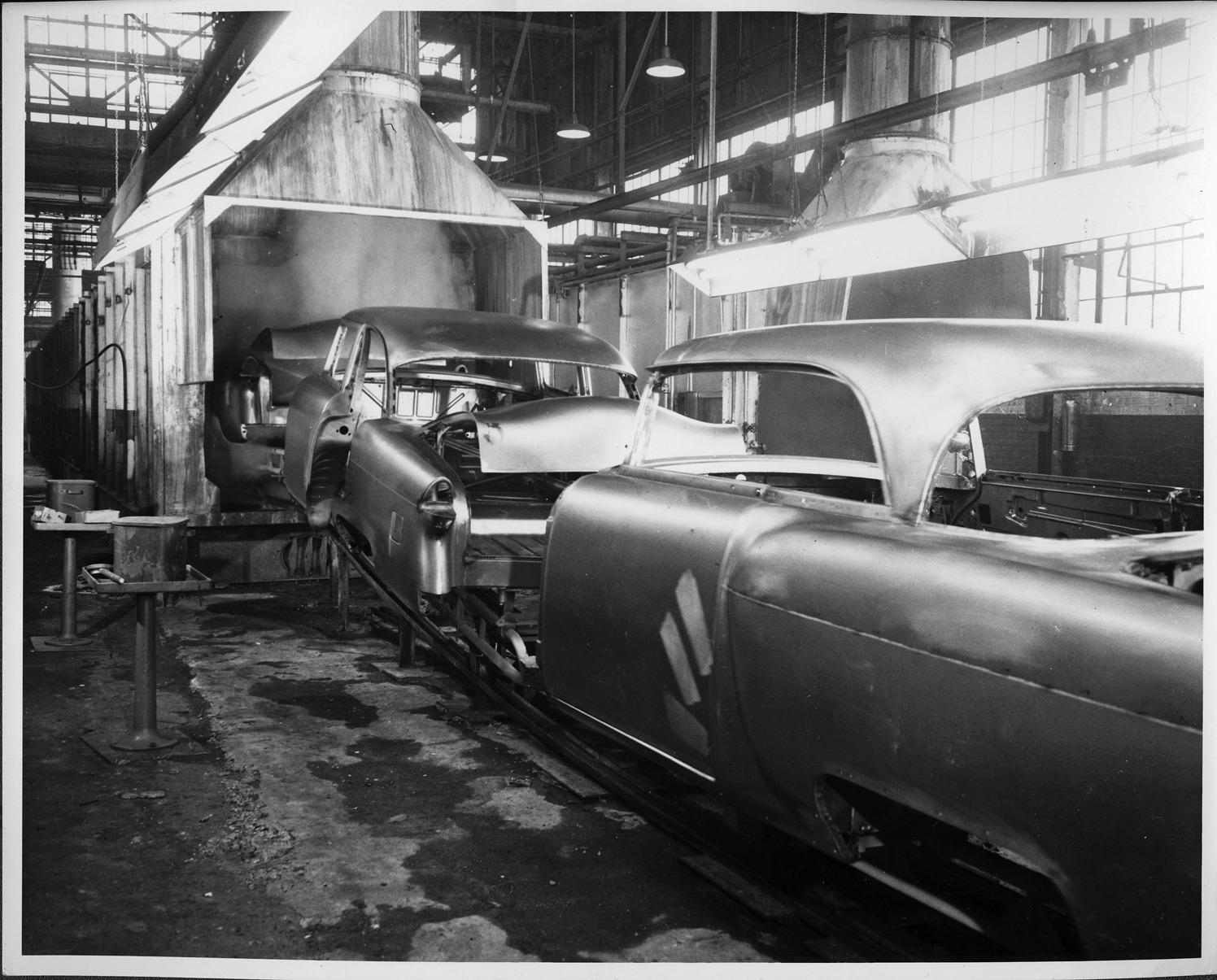 Packard Co. file photograph of a 1955 Packard metal bodies on assembly line, three-quarter rear view, going into large spraying tunnel. Inscribed on photo back: "Packard Motor Car Co. production line, Conner Avenue facility, 1955 Packard Clipper, fifty-fifth series."