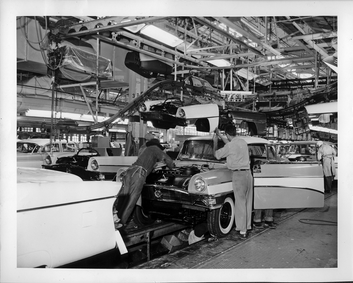Packard Co. file photograph of 1956 Packard bodies on assembly line, three-quarter front view, hood raised, workers assembling parts, front ends and seats hanging on overhead track. Inscribed on photo back: "Packard Motor Car Co. production line, Conner Avenue facility, 1956 Packard Clipper custom models, fifty-sixth series."