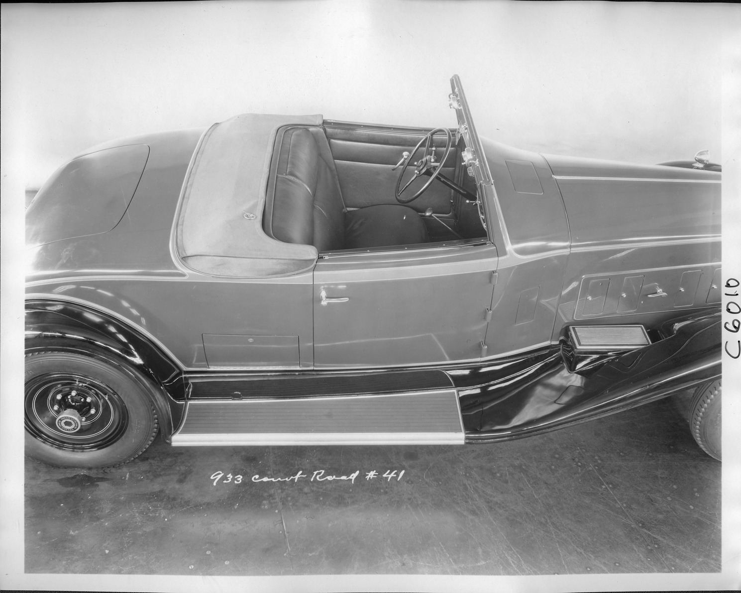 Packard Co. file photograph of a 1932 Packard right side elevation view, top folded, interior visible. Inscribed on photo back: "Experimental, 1932 Packard eight, ninth series, model 902, 8-cylinder, 110-horsepower, 136.5-inch wheelbase, 2/4-person coupe roadster (body type #509), prototype; labeled model 933."
