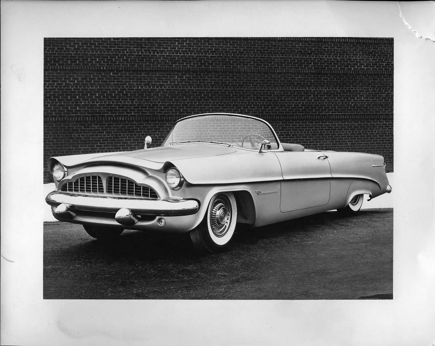 Packard Co. file photograph of a 1954 Packard three-quarter front left view, top folded. Photo caption on back from Packard Public Relations Dept.: "Experimental, 1954 Packard, the Packard panther, a full sized plastic sports car, is the first of its type specially designed using a high horsepower engine capable of record speed, the car, a 3-person model with advanced styling in its one-piece plastic body, is the result of 3 years of design & materials study by the engineering division of P.M.C. Co., first public showing is now being held at New York, not aimed at highway use, the panther is powered by a new Packard 275-horsepower engine utilizing forced draft carburetion, the experimental car is one of several Packard has under development as a result of its studies of plastics for both tooling & product use, one section of the company's new styling division has a project working on design, while another section works to develop plastic dies for metal parts to get lower manufacturing costs, this would allow the company to further customize standard cars which could be built economically in limited numbers with special custom features."