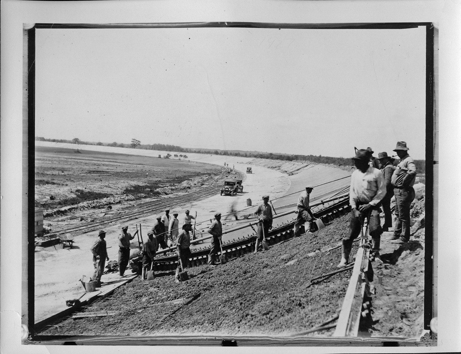 View of construction of the track at Packard Proving Grounds in Utica, Michigan, several male workers pictured with shovels. Handwritten on back: "Packard Motor Car Co. Proving Grounds, Utica, Michigan. Track construction, 1927-28."