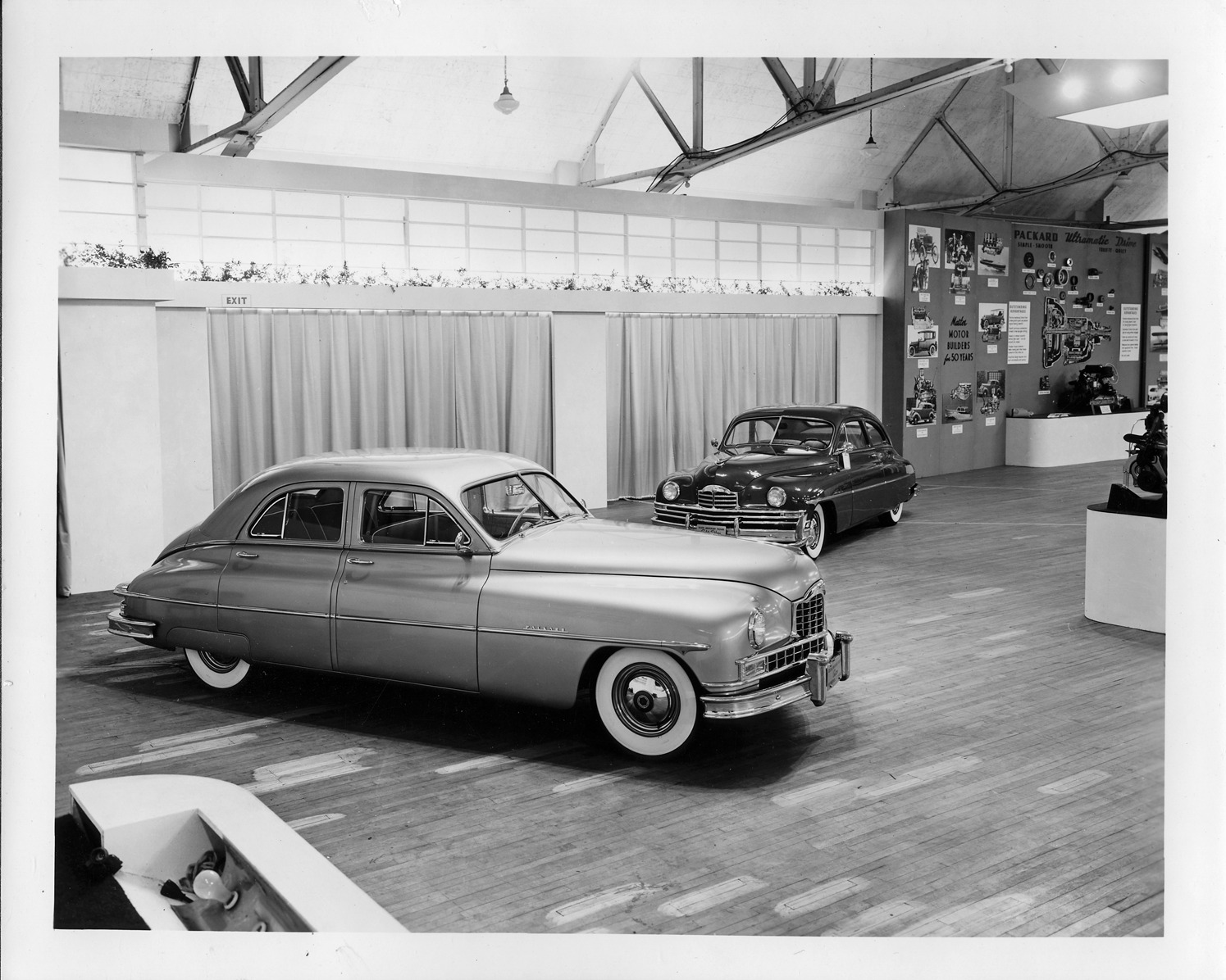 Packard Co. file photograph of two 1949 Packard sedans on display for 1949 dealers show for Packard Golden Anniversary, foreground: seven-eighths right side view, 4-door sedan, dual white side wall tires; background: three-quarter front view, 2-door sedan, dual white sidewall tires, photograph display in right background.