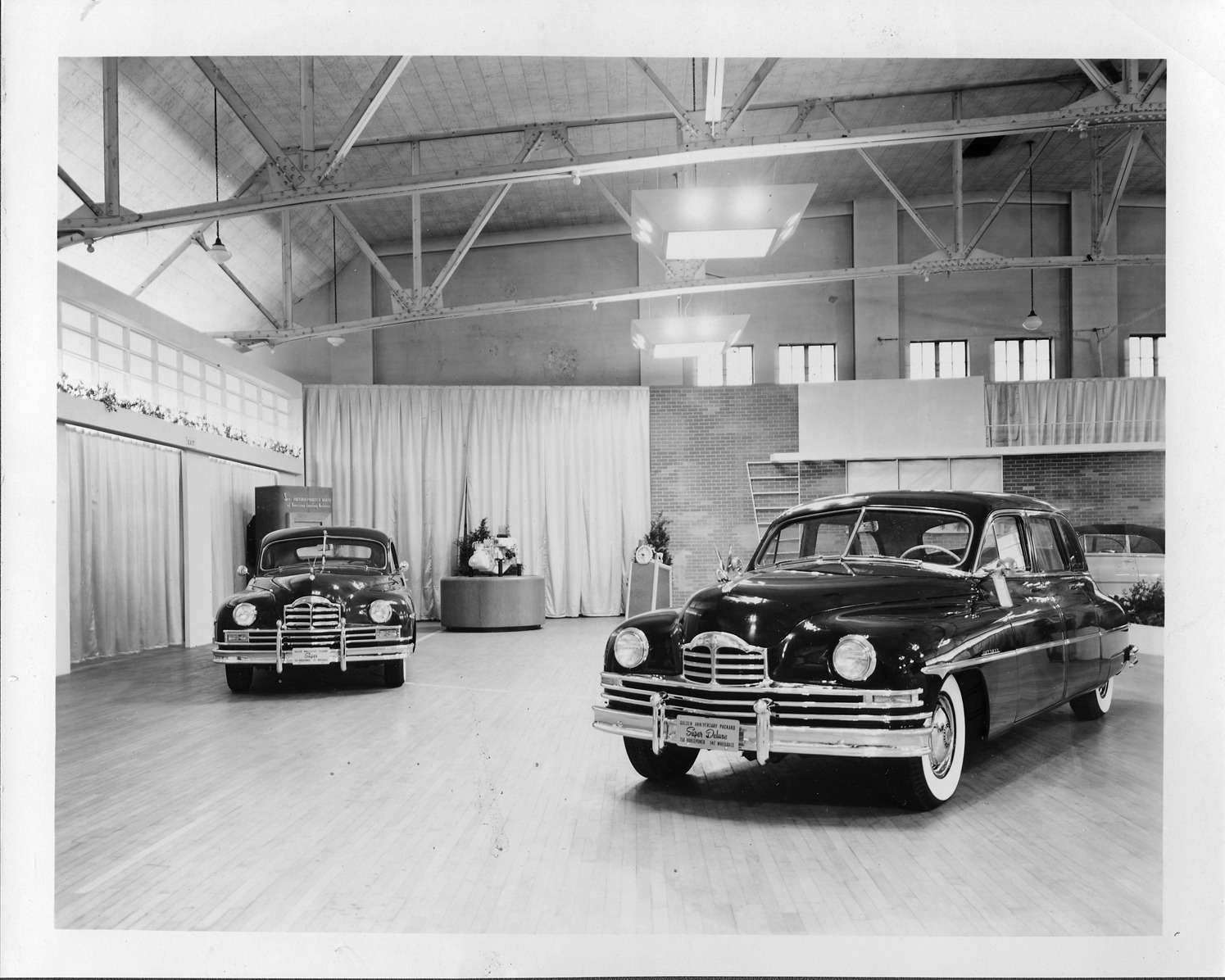 Packard Co. file photograph of two 1949 Packard sedans on display for 1949 dealers show for Packard Golden Anniversary, foreground: seven-eighths three-quarter front view, 4-door sedan, dual white side wall tires, pelican emblem, label on license plate frame reads "Golden Anniversary Packard super deluxe, 150-horsepower, 141-inch wheelbase"; background: front view, sedan, dual white sidewall tires, label on license plate frame reads "Golden Anniversary Packard super, 150-horsepower, 127-inch wheelbase."