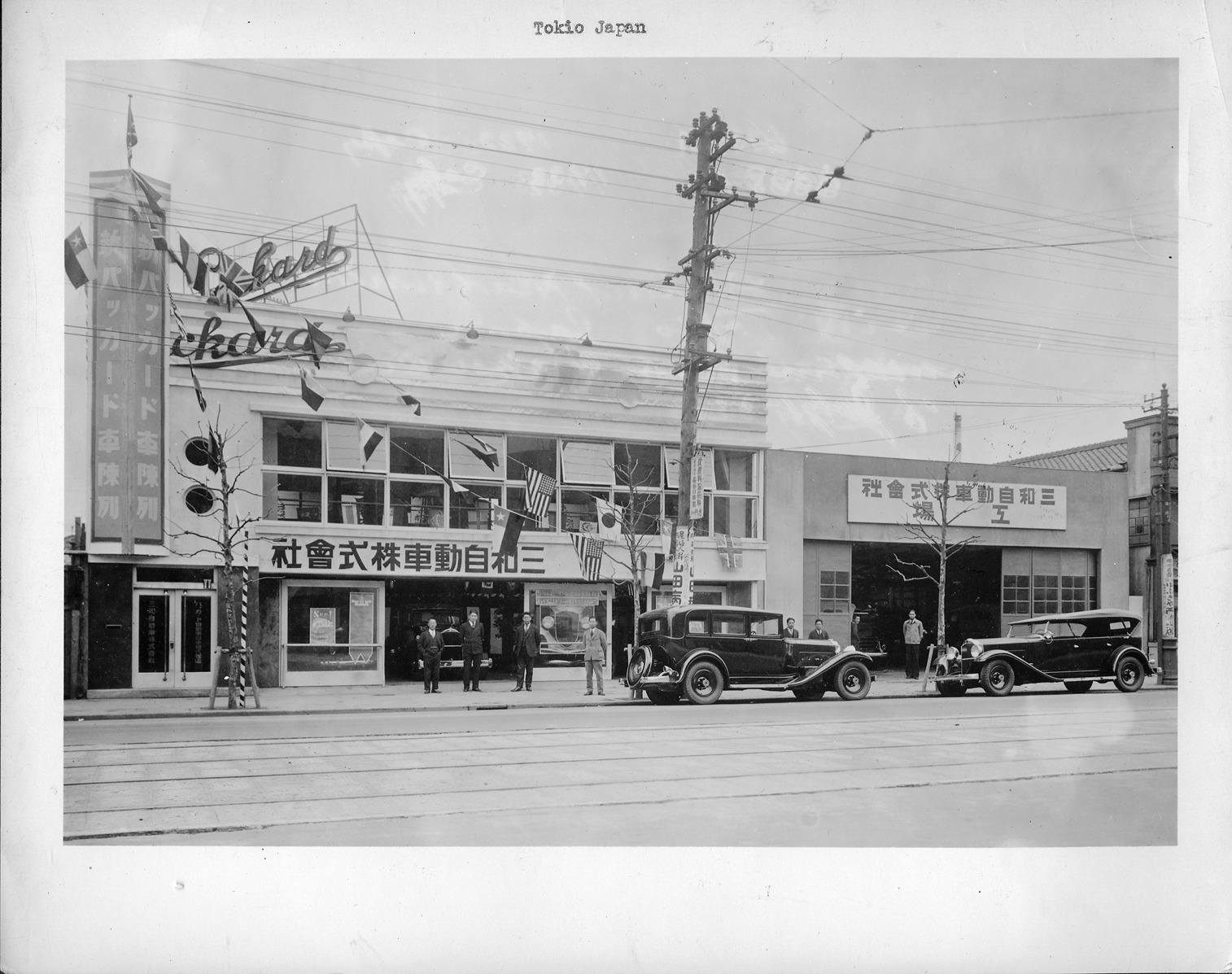 Favorite this☆ Packard headquarters in Tokyo, Japan, 1932 Description: Packard Co. file photograph of Packard headquarters in Tokyo, Japan in 1932. Building signs written in Japanese, sign on building reads "Packard," four men standing in front of building, two cars parked on street. Details Resource ID: EB01e914 Creator: Packard Motor Car Company Subject: Packard automobile Automobile dealers--Japan--Tokyo Photographic prints Date Issued: 1932 Format: 1 photographic print ; 8 x 10 in. Member of: National Automotive History Collection Packard Collection Rights: Physical rights are retained by DPL. Copyright is retained in accordance with U.S. copyright laws.