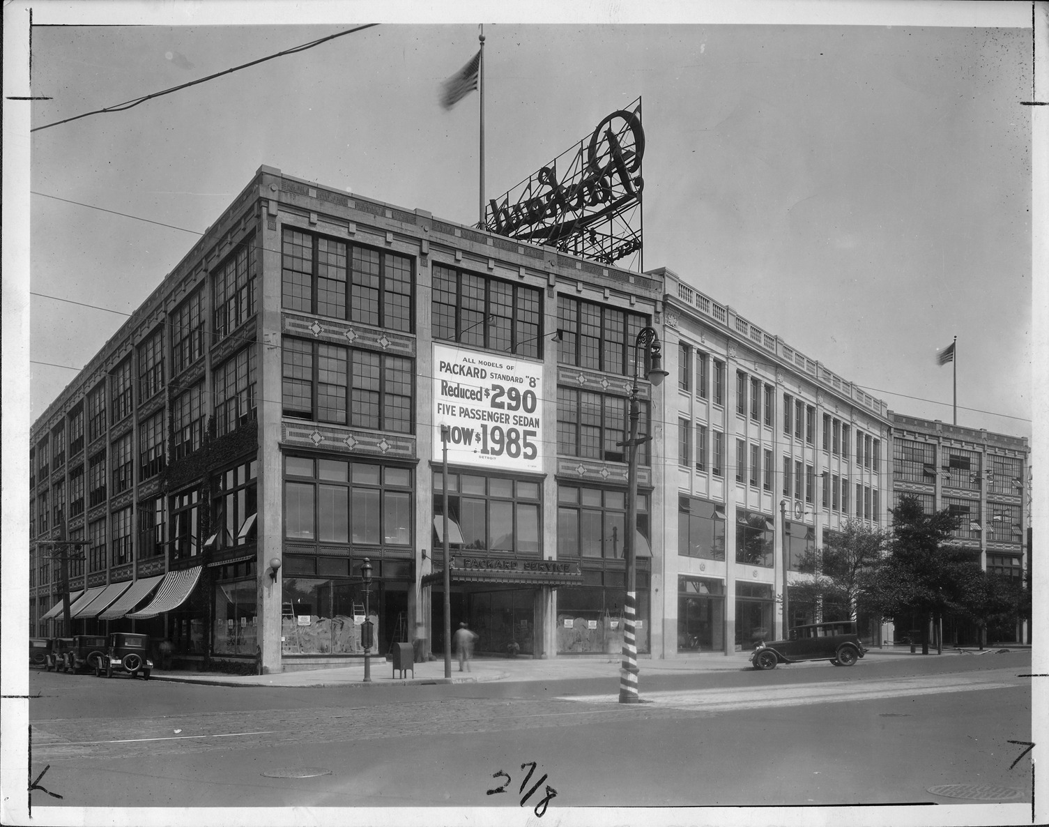 Packard Co. file photograph of the Alvan T. Fuller Packard dealership, located at 1089 Commonwealth in Boston, Massachusetts. "Packard Service" above door, sign on side of building reads "All models of Packard standard "8," reduced $290 five passenger sedan new $1985." Inscribed on photo back: "Packard Motor Car Co., branches/dealerships/agencies, Boston, Massachusetts, note automobile at right; 1924 Packard 233, second series six, 6-cylinder, 54-horsepower, 133-inch wheelbase, 7-person sedan (body type #228)."