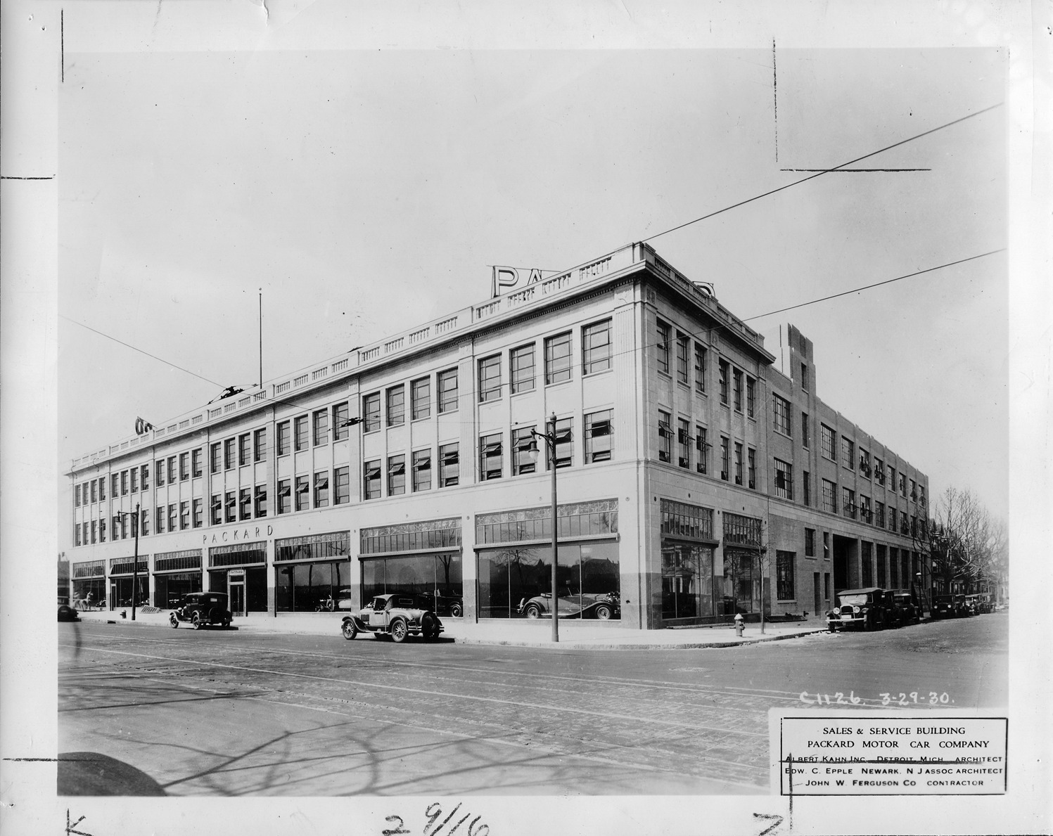 Packard Co. file photograph of a Packard dealership, building sits on corner, "Packard" above door. Inscribed on photo back: "Packard Motor Car Co., branches/dealerships/agencies, Newark, N.J., automobiles left to right: 1928-29 Ford model A, 5-person Tudor, (shown in window), 1930 Packard 745, seventh series deluxe, 8-cylinder, 106-horsepower, 145.5-inch wheelbase, 5-person Dietrich convertible sedan (body type #1602), 1927 Chrysler imperial "80," 6-cylinder, 2-4 person roadster, (show window) 1930 Packard 740, seven-series custom, 8-cylinder, 106-hosepower, 140.5-inch wheelbase, 2/4-person roadster (body type #412), 1924 Packard 226, second series six, 6-cylinder, 54-horsepower, 126-inch wheelbase, 4-person sport model (body type #224)."