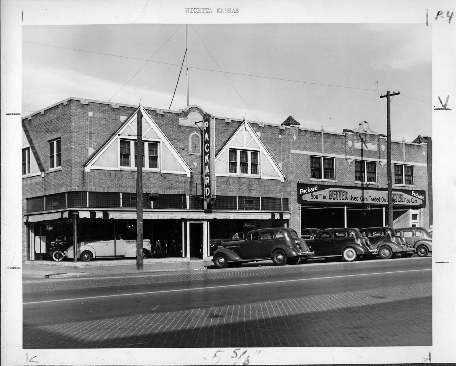 Packard Co. file photograph of a Packard dealership in Wichita, Kan. in 1941 showing front of building, cars parked on street, "Packard" sign above door, sign on right side of building reads "Packard, you find better used cars traded on better new cars," convertible in front left corner show window.