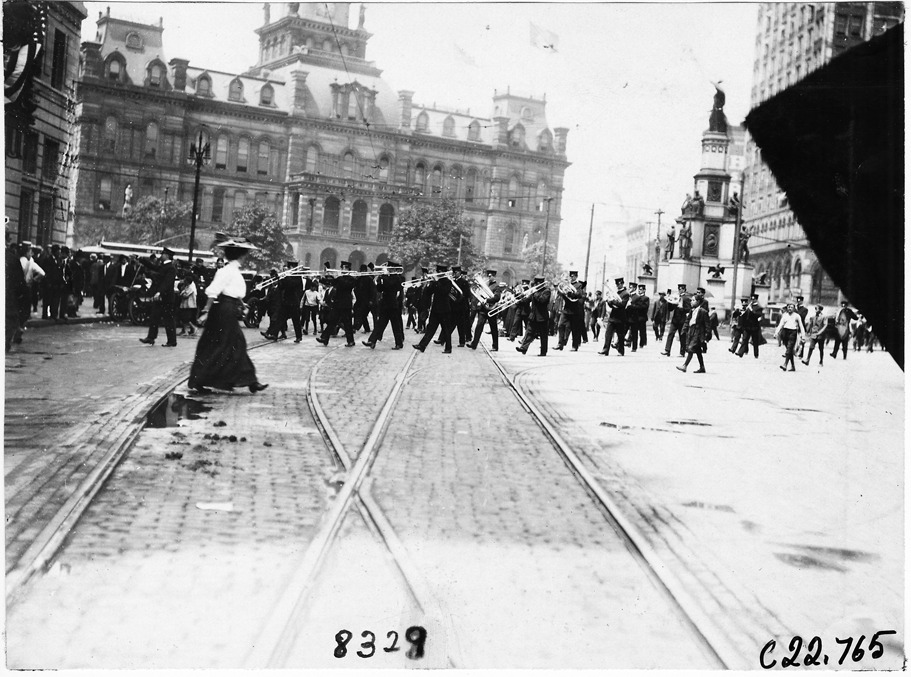 View of a marching band in a parade, crossing in front of the Soldier and Sailors Monument and City Hall. Trolley tracks visible in foreground. July 10, 1909. Stamped on back: "Photo by N. Lazarnick, 29 West 42nd Street, N.Y., tel. 594 Bryant."