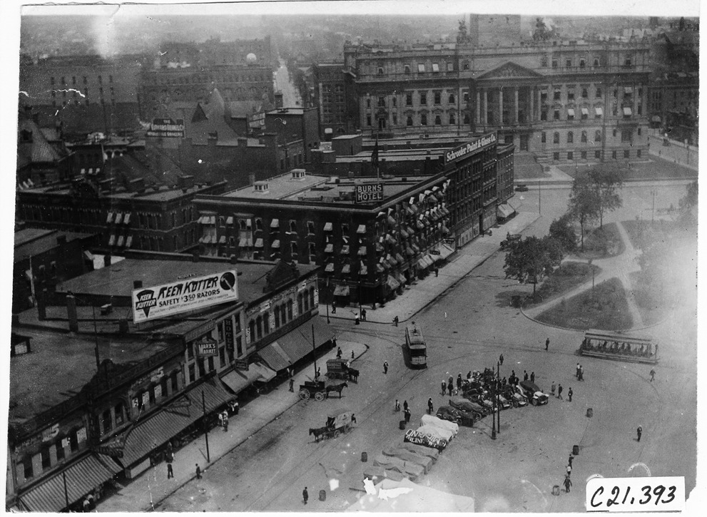 Aerial view of Cadillac Square in Detroit, Wayne County building in background, people, horse-drawn carriages, and street cars pictured in street below, sign on top of building reads "Ken Kutter safety $3.50 razors." July 10, 1909.