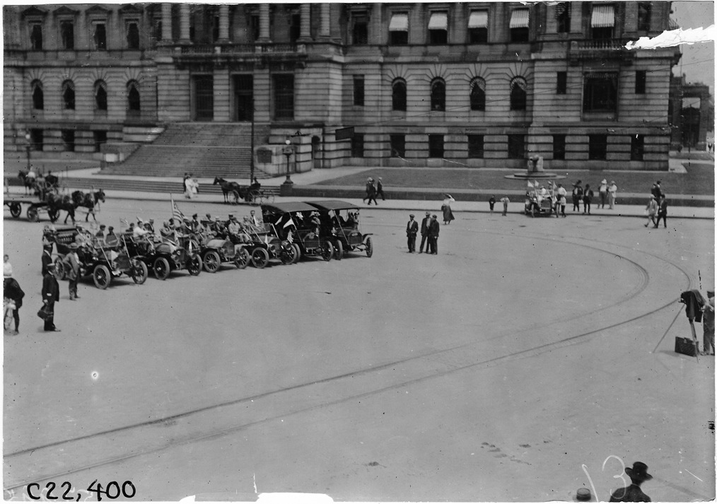 View of reception cars at start of 1909 Glidden Tour in front of the Wayne County building, Detroit, Michigan