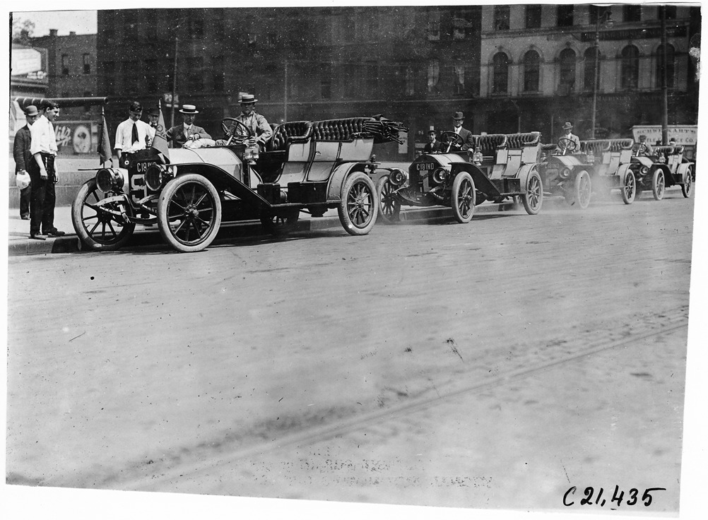 Four Premier cars in the 1909 Glidden Tour automobile parade, Detroit, Michigan