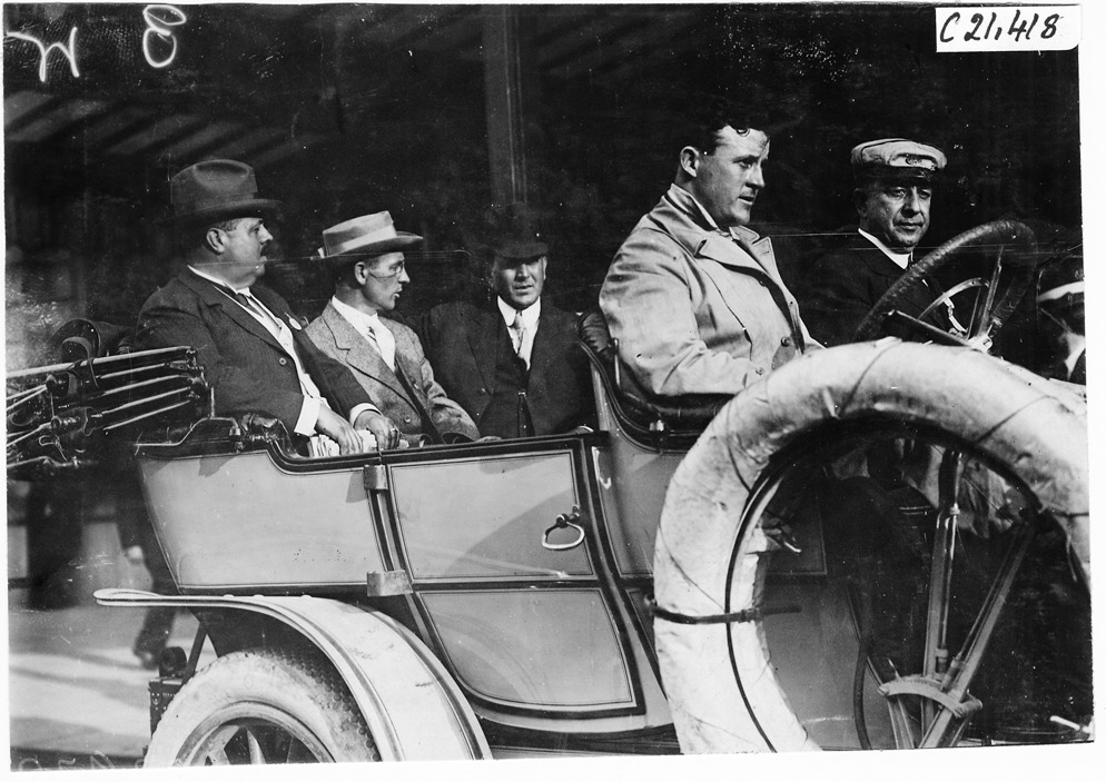 View of a participating car, top folded, with driver and four male passengers, in suits and hats. Ray McNamara, Chairman Hower, and C. Glidden in the Premier car in the automobile parade, Detroit, Michigan, July 10, 1909. Photo edges cut unevenly.