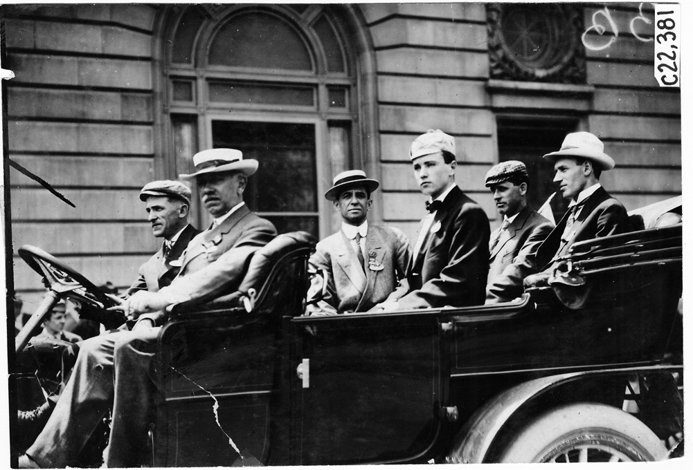 View of a participating car with driver and five male passengers in suits and hats. "Automobile" and "Motor Age" press representatives in Thomas Flyer car at Detroit, Michigan, July 10, 1909. Photo edges cut unevenly. Stamped on back: "Spooner & Wells, Inc., photographers, telephones 3472-3473 Columbus, 1931 Broadway, New York."
