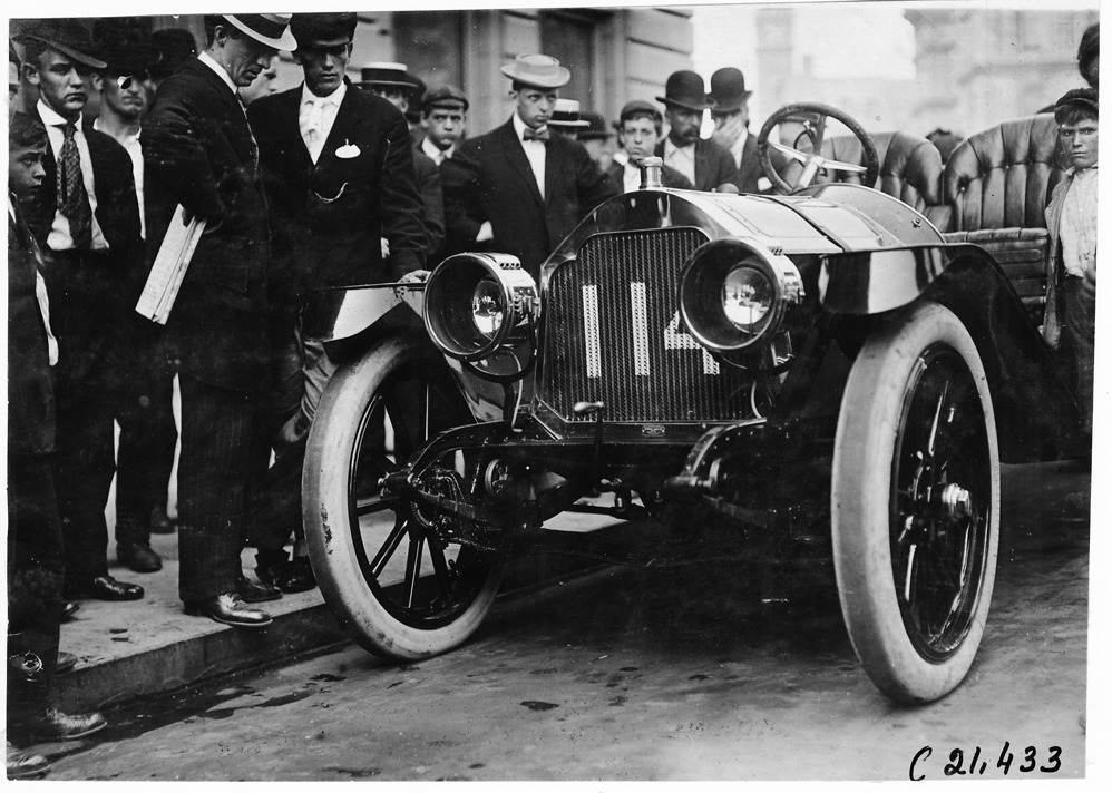 View of a participating car, # 114 painted on grille, group of men and boys standing to left of car, all in suits and hats. The Lexington car equipped with Hartford suspension in the automobile parade, Detroit, Michigan, July 10, 1909. Photo edges cut unevenly.