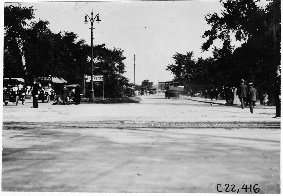 View of Glidden Tour automobile parade on Belle Isle. Looking across from Belle Isle at Detroit, Michigan, July 10, 1909. Photo edges cut unevenly. Stamped on back: "Spooner & Wells, Inc., photographers, telephones 3472-3473 Columbus, 1931 Broadway, New York."