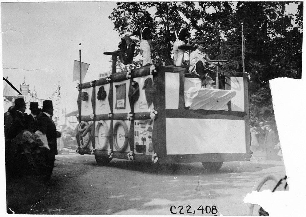 View of Morgan & Wright parade float in Glidden Tour automobile parade, Detroit. Right side of picture torn. Photo edges cut unevenly. Stamped on back: "Spooner & Wells, Inc., photographers, telephones 3472-3473 Columbus, 1931 Broadway, New York."