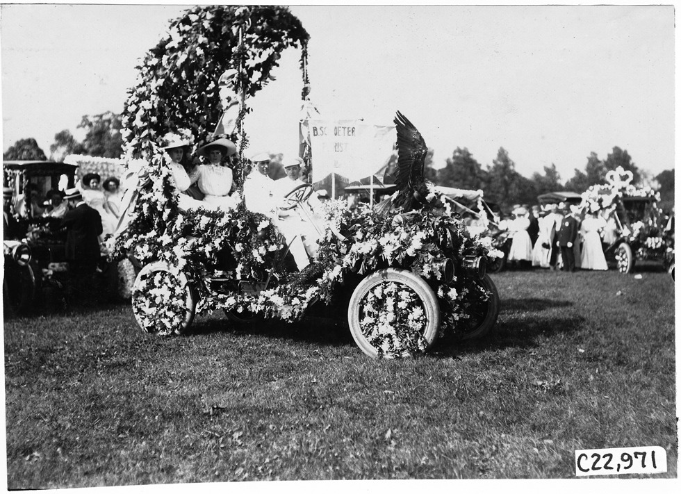 Decorated car, 1909 Glidden Tour automobile parade, Detroit, Michigan