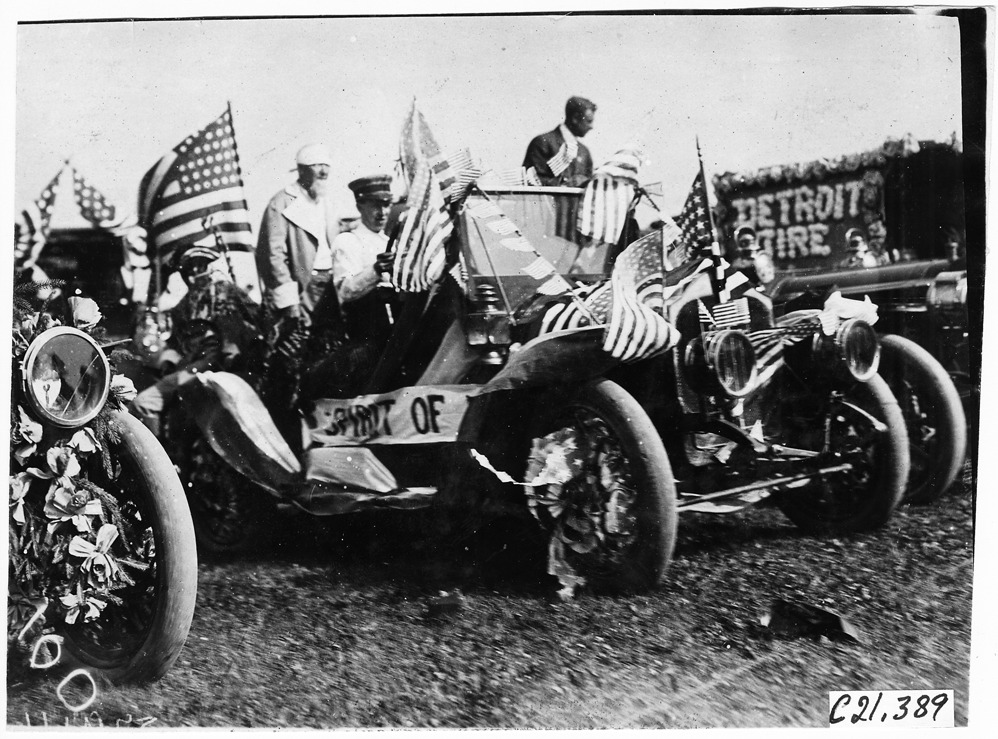 View of Elmore car decorated with American flags, Spirit of '76 sign, parked on grass, "Detroit Tire" sign in flowers in background, in the automobile parade at Detroit, Michigan, July 10, 1909. Photo edges cut unevenly.