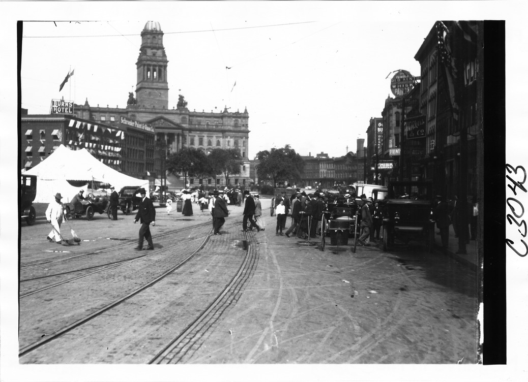 View of a tent, participating cars, men walking across trolley tracks, street cleaner sweeping, Wayne County building in background, businesses on right, Burns Hotel on left. Glidden Tour, Detroit, Michigan, July 1909.