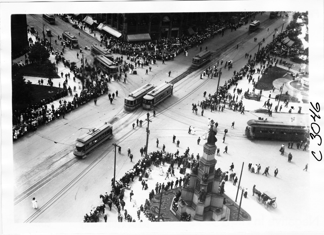 View of an aerial view of Campus Martius, looking northwest at Woodward and Michigan, the Soldiers and Sailors monument in lower right corner, street cars traveling through intersection, several crowds pictured. Glidden Tour, Detroit, Michigan, 1909.