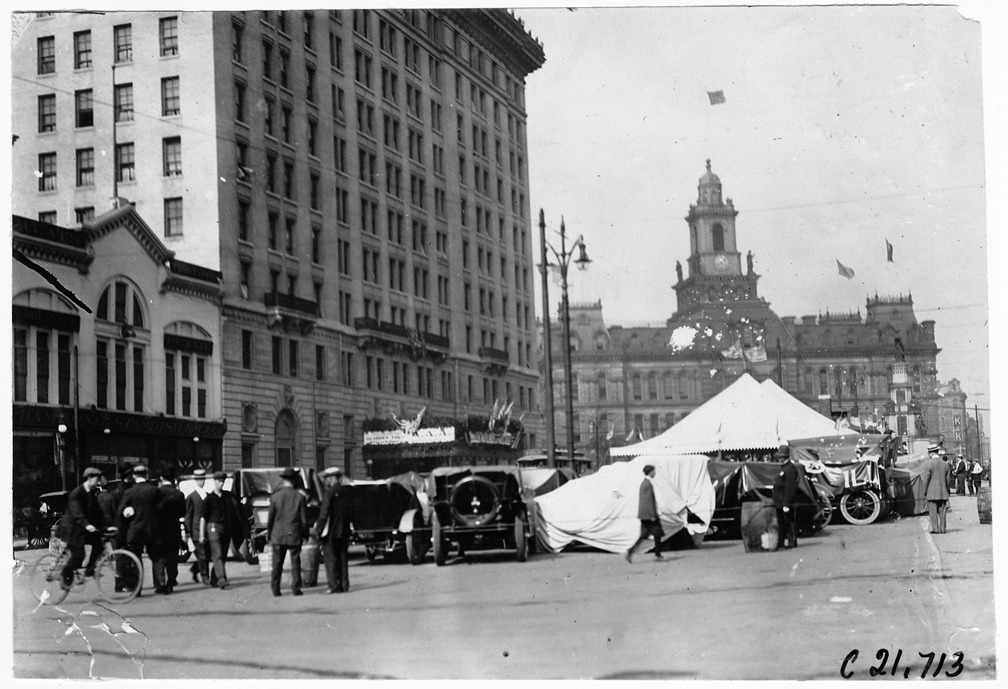 View of a tent, participating cars, in front of Pontchartrain Hotel, Detroit City Hall in background. General view showing the cars parked prior to the commencement of the tour, July 12, 1909, Detroit, Michigan. Photo edges cut unevenly. Stamped on back: "Photo by Spooner & Wells, Inc. 1931 Broadway, N.Y."