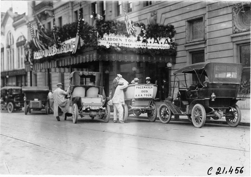 View of several cars parked in front of the Pontchartrain Hotel, including a Premier with sign on back "Pacemaker 1909 A.A.A. Tour," men in suits and straw hats in and next to it. Detroit, Michigan, 1909. Photo edges cut unevenly. Stamped on back: "Spooner & Wells, Inc., photographers, telephones 3472-3473 Columbus, 1931 Broadway, New York."