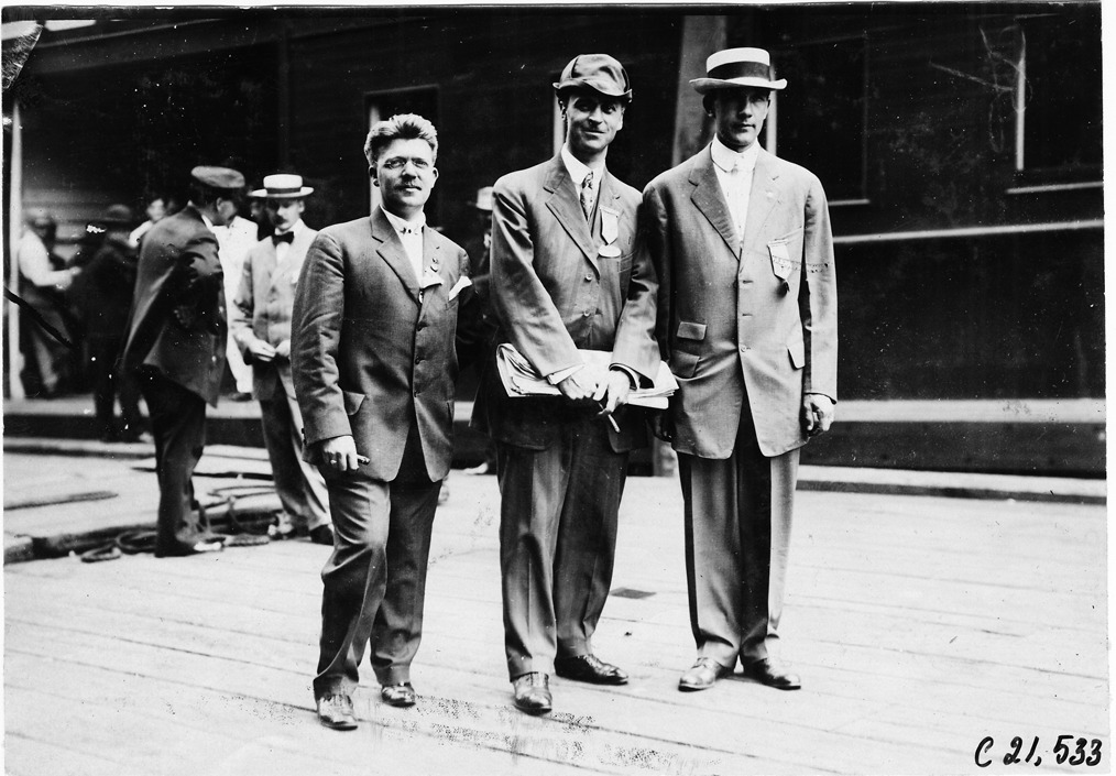 View of three men posing, R. Davis and E. Lorie, John Gillespie, secretary of the Automobile Club, at Detroit, Michigan, 1909. Photo edges cut unevenly. Stamped on back: "Spooner & Wells, Inc., photographers, telephones 3472-3473 Columbus, 1931 Broadway, New York."