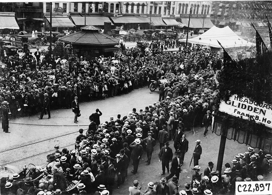 View of crowd of men, women, boys and band members parted for cars at start of the Glidden Tour, in front of Pontchartrain Hotel, inspection tent in Cadillac Square in background, Detroit, Michigan, July 1909.