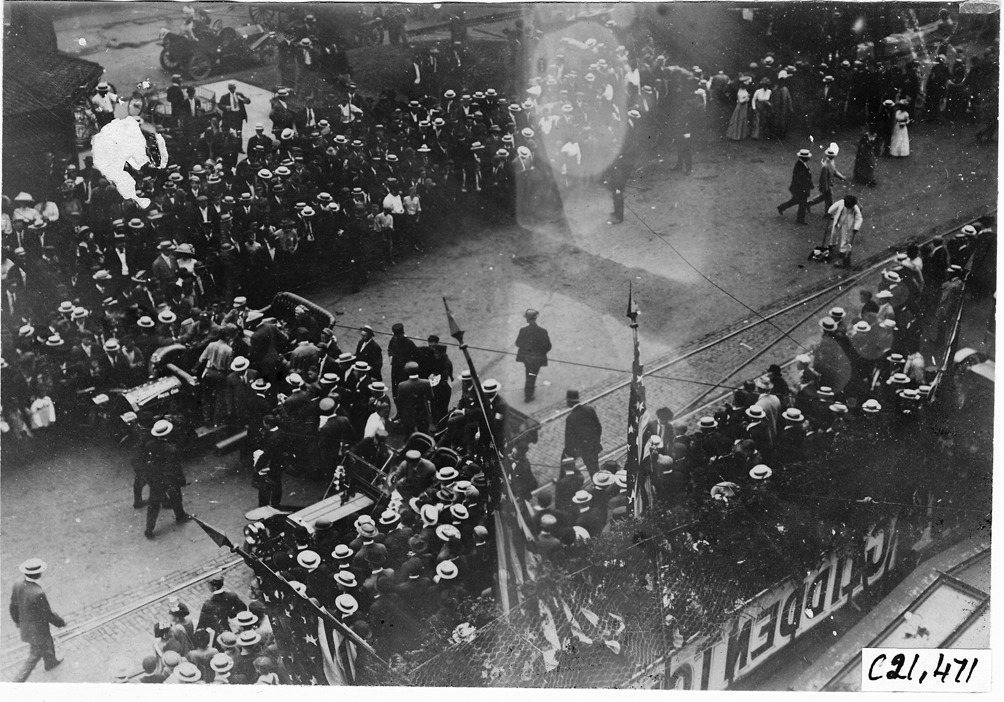 View of two cars side by side in street, crowd lining street, U.S. flags protruding, at start of the Glidden Tour, Detroit, Michigan, July 12, 1909. Emulsion gone from spot in left corner, faded area in middle of image. Photo edges cut unevenly. Stamped on back: "Spooner & Wells, Inc., photographers, telephones 3472-3473 Columbus, 1931 Broadway, New York."