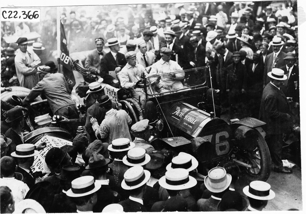 View of Thomas Flyer car in street, with driver, mechanic and four passengers, other car alongside, surrounded by crowd of men in suits and straw hats, at start of the Glidden Tour, Detroit, Michigan, July 12, 1909. Photo edges cut unevenly.