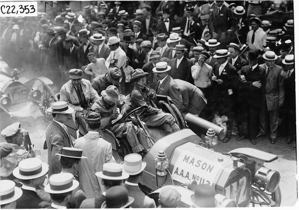 View of Mason car in street, driver and passengers all in motoring gear, surrounded by crowd of men in suits and straw hats, at start of the Glidden Tour, Detroit, Michigan, July 12, 1909. Small hole near top of image. Photo edges cut unevenly. Stamped on back: "Spooner & Wells, Inc., photographers, telephones 3472-3473 Columbus, 1931 Broadway, New York."