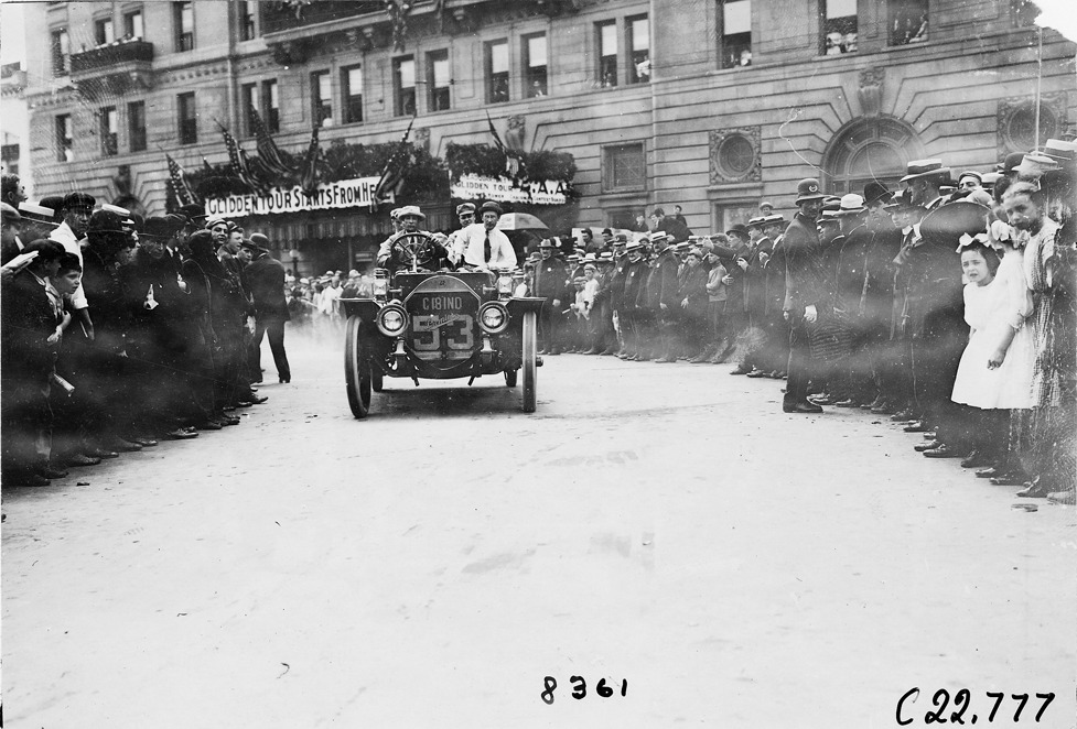 View of Premier #53, passing by the Pontchartrain Hotel surrounded by a crowd of men, at start of Glidden Tour, Detroit, Michigan, 1909. Stamped on back: "Photo by N. Lazarnick, 29 West 42nd Street, N.Y., tel. 594 Bryant."