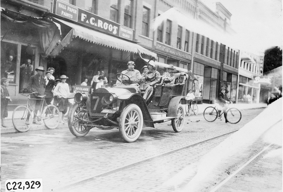 Favorite this☆ Car and bicycles at the 1909 Glidden Tour Description: View of car #79, with bicycles in background, in front of F.C. Root store, at Glidden Tour, (Kalamazoo?), Michigan, 1909. Details Resource ID: EB01f311 Subject: Glidden Tour (1909) Automobile driving--Competitions--United States Automobiles Bicycles Photographic prints Date Issued: 1909-07 Format: 1 photographic print ; 4.5 x 6.5 in. Member of: National Automotive History Collection Lazarnick Collection Filing Location: Tours--Glidden Tour, 1909 Negative Number: Negative #C22,929 Rights: Physical rights are retained by DPL. Copyright is retained in accordance with U.S. copyright laws.