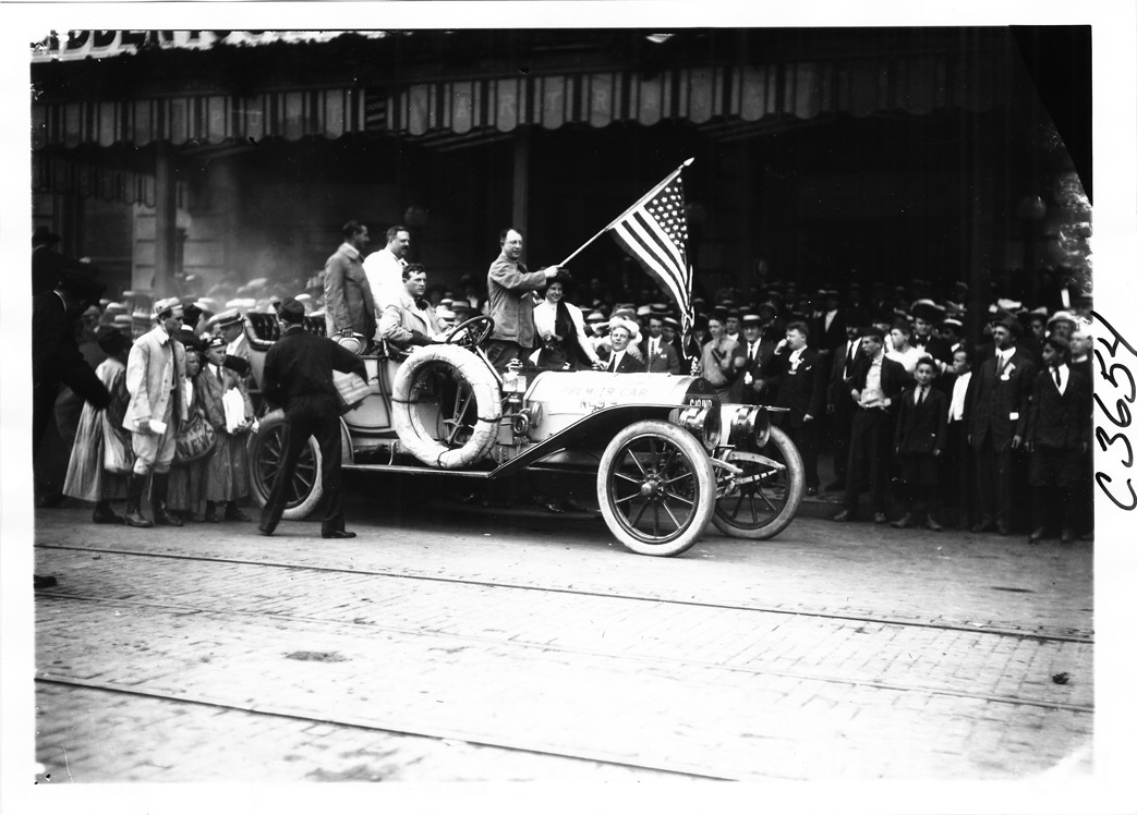 View of chairman's car, Premier #99, driver Ray McNamara, with male passenger waving American flag, in front of the Pontchartrain Hotel, surrounded by crowd including newsboy, at start of Glidden Tour, Detroit, Michigan, 1909.