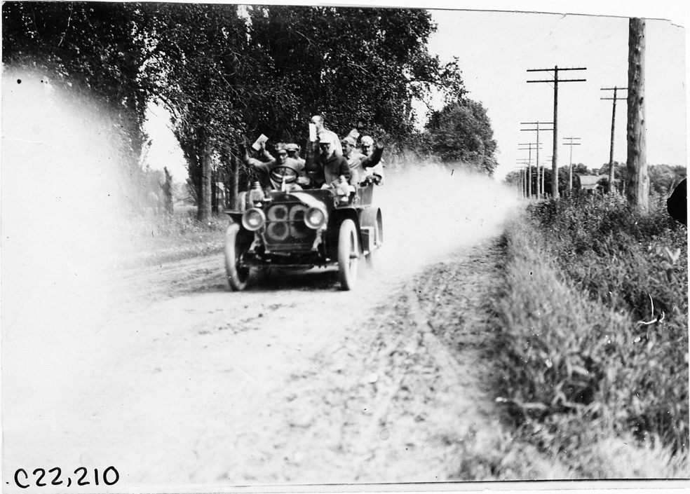 View of Studebaker car #80, driven by Dan McIntosh, driver and five passengers waving, cloud of dust behind and in front of car, near Farmington, Michigan, 1909 Glidden Tour. Photo edges cut unevenly. Stamped on back: "Photo by Spooner & Wells, Inc. 1931 Broadway, N.Y."
