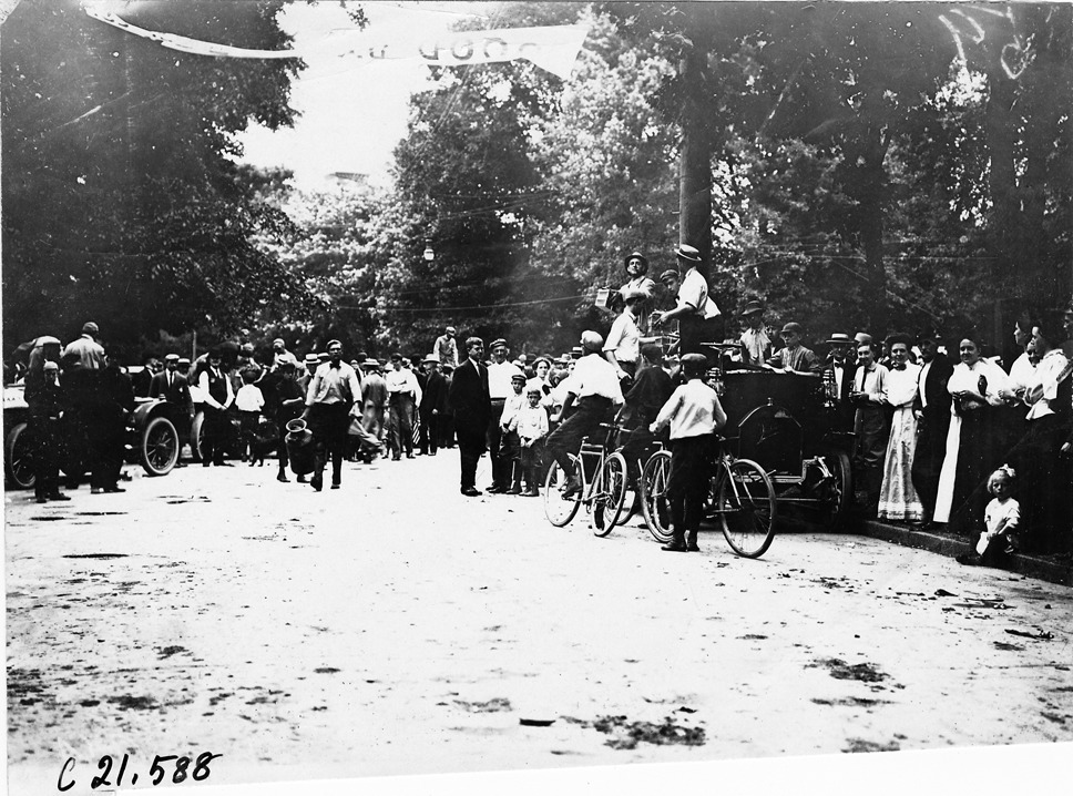 View of men standing on car handing out box lunches, women and children lining streets, boys on bicycles, man carrying milk can walking toward photographer. Caption on photo back: "Where the free gasoline and lunches were given by the Jackson Automobile Co. of Jackson, Mich." 1909 Glidden Tour. Photo edges cut unevenly.