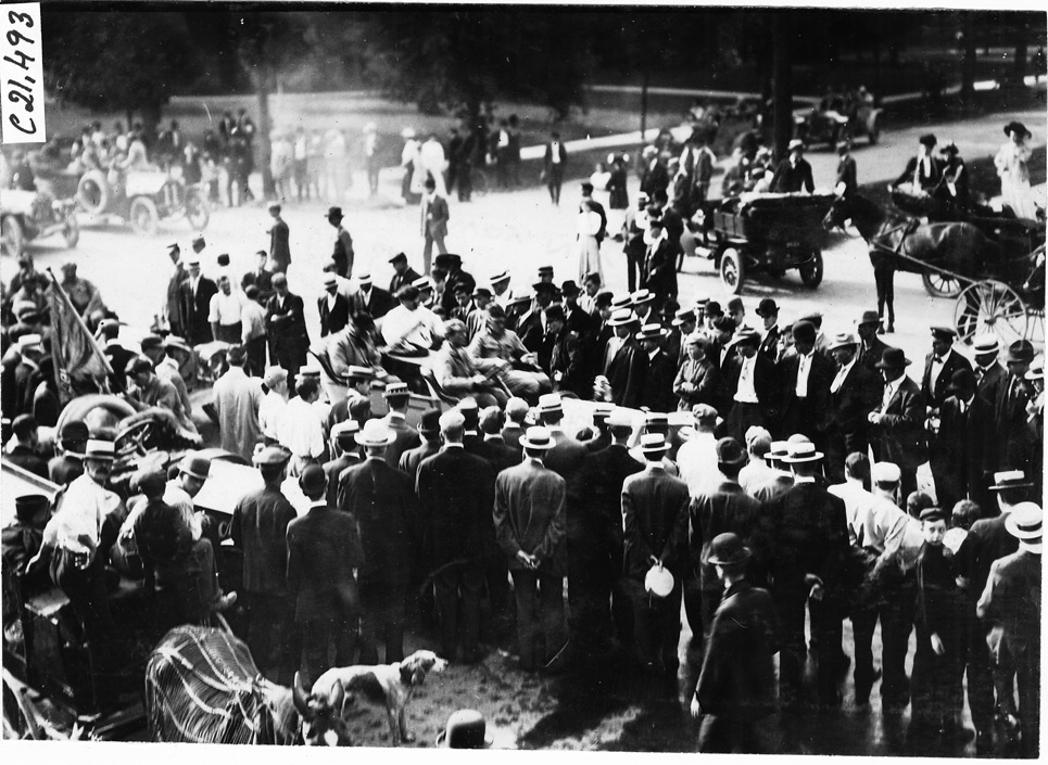 Crowd surrounding cars checking in at Kalamazoo, Michigan, 1909 Glidden Tour