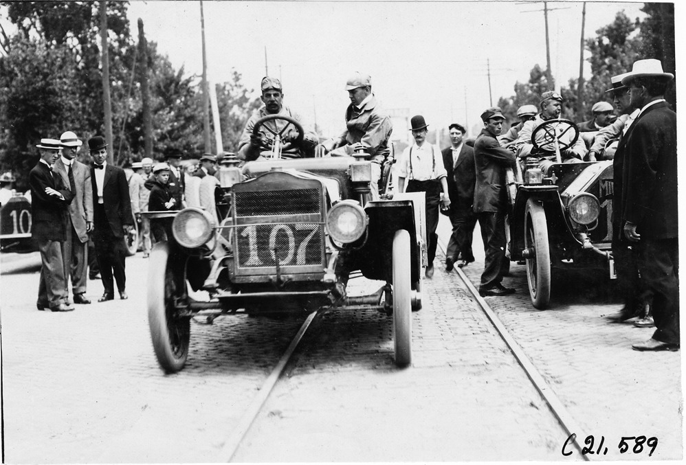 View of Charles Goldthwaite and passenger in Maxwell car #107 arriving in South Bend, Indiana, at 1909 Glidden Tour. Photo edges cut unevenly. Stamped on back: "Spooner & Wells, Inc., photographers, telephones 3472-3473 Columbus, 1931 Broadway, New York."