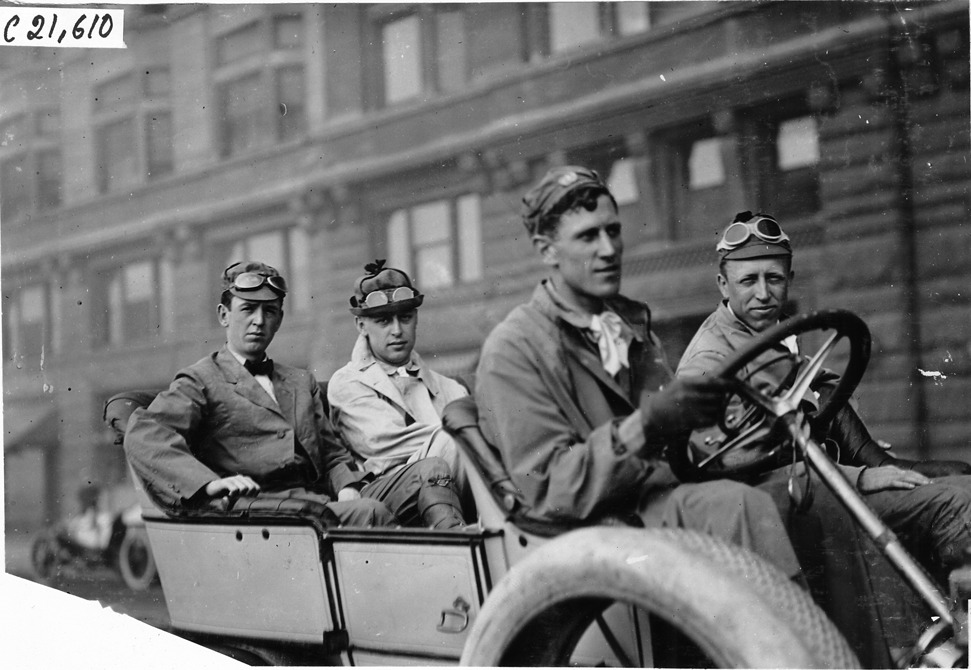 View of Harry Bill and Harry Ford and two other passengers in Chalmers-Detroit press car in front of Auditorium Annex building in Chicago, Illinois, at 1909 Glidden Tour. Lower left corner of photo is missing. Photo edges cut unevenly. Stamped on back: "Spooner & Wells, Inc., photographers, telephones 3472-3473 Columbus, 1931 Broadway, New York."