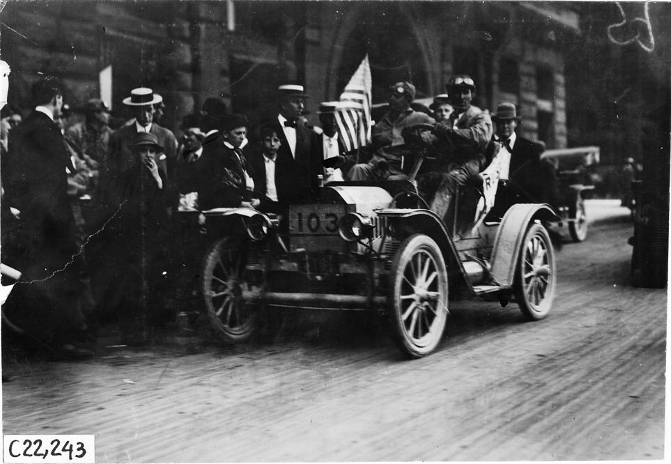 Brush runabout car # 103 with driver and three passengers at the 1909 Glidden Tour