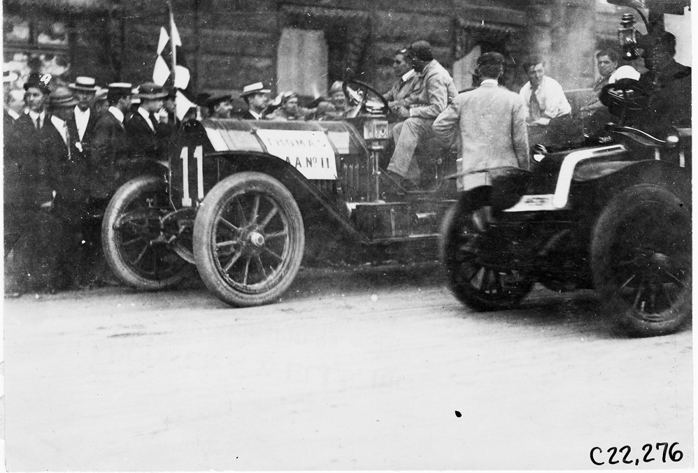 View of E.O. Hayes in the Midland car arriving at Chicago, with a vehicle passing by, and a group of men looking on, at the 1909 Glidden Tour. Stamped on back: "Spooner & Wells, Inc., photographers, telephones 3472-3473 Columbus, 1931 Broadway, New York."