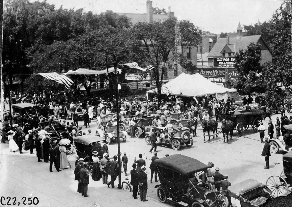 General view of the reception at Milwaukee where lunch and liquid refreshments were received, showing tent, horses and buggy, spectators, participants' cars, American flags, with business signs in background, at the 1909 Glidden Tour. Photo edges cut unevenly. Stamped on back: "Photo by Spooner & Wells, Inc. 1931 Broadway, N.Y."
