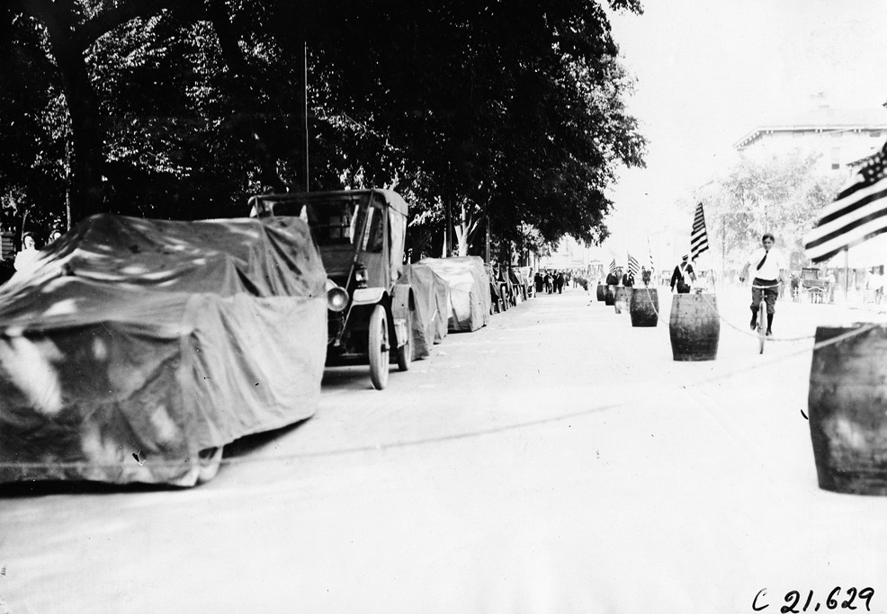 View of a line of cars parked on the side of the street, some with covers on them, at the 1909 Glidden Tour.