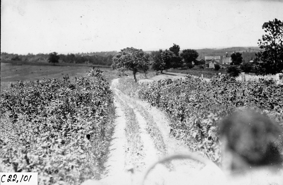 Driver's eye view of narrow road near Wonewoc, Wisconsin, 1909 Glidden Tour