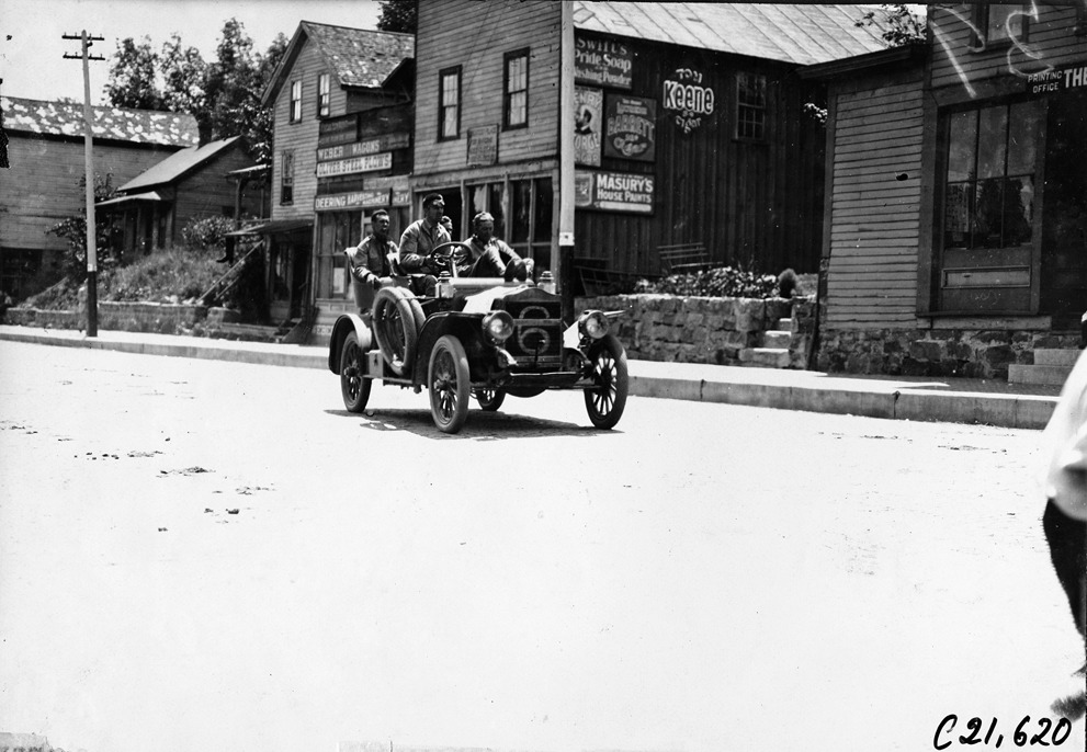 View of E.G. Gager and three passengers in Maxwell #6 entering Elroy, Wisconsin, shops and printing office in background, at the 1909 Glidden Tour. Stamped on back: "Photo by Spooner & Wells, Inc. 1931 Broadway, N.Y."
