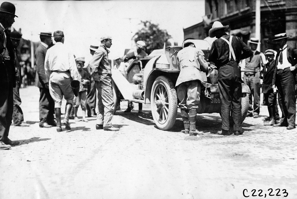 Men adding fluids to car in Elroy, Wisconsin, 1909 Glidden Tour