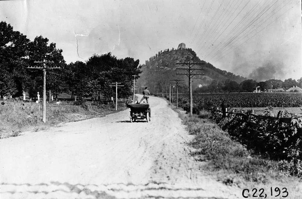 Glidden tourists on road heading toward Sugarloaf Mountain in Winona, Wisconsin, 1909 Glidden Tour